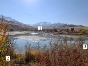 а – Адыгене сайынын кеңейиши; б – Ала-Арча сайынын кеңейиши; 1 – Адыгене дарыясы; 2 – Ала-Арча дарыясы; 3 – Муратай коктусу; 4 – селдин агуу багыты; 5 – шилендилердин топтоо чеги; 6 – майда бадал.