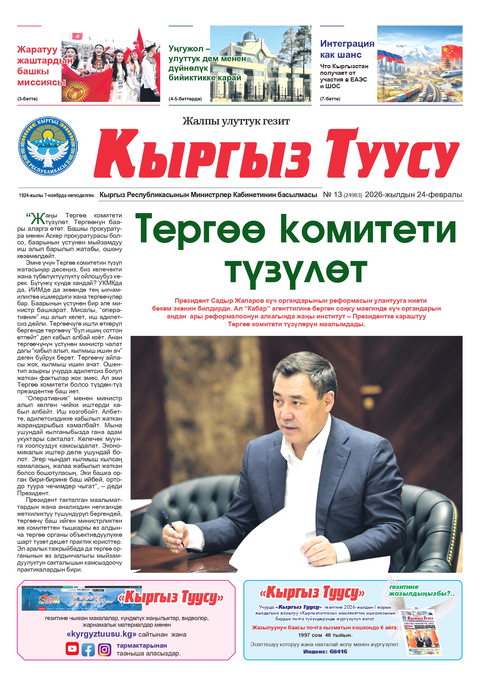 Гезит №13 (24983) 2026-жылдын 24-февралы автор Гулмайрам Рахманбердиева - 24.02.2026 0 488 Бөлүшүү FacebookXWhatsAppTelegramEmailCopy URL