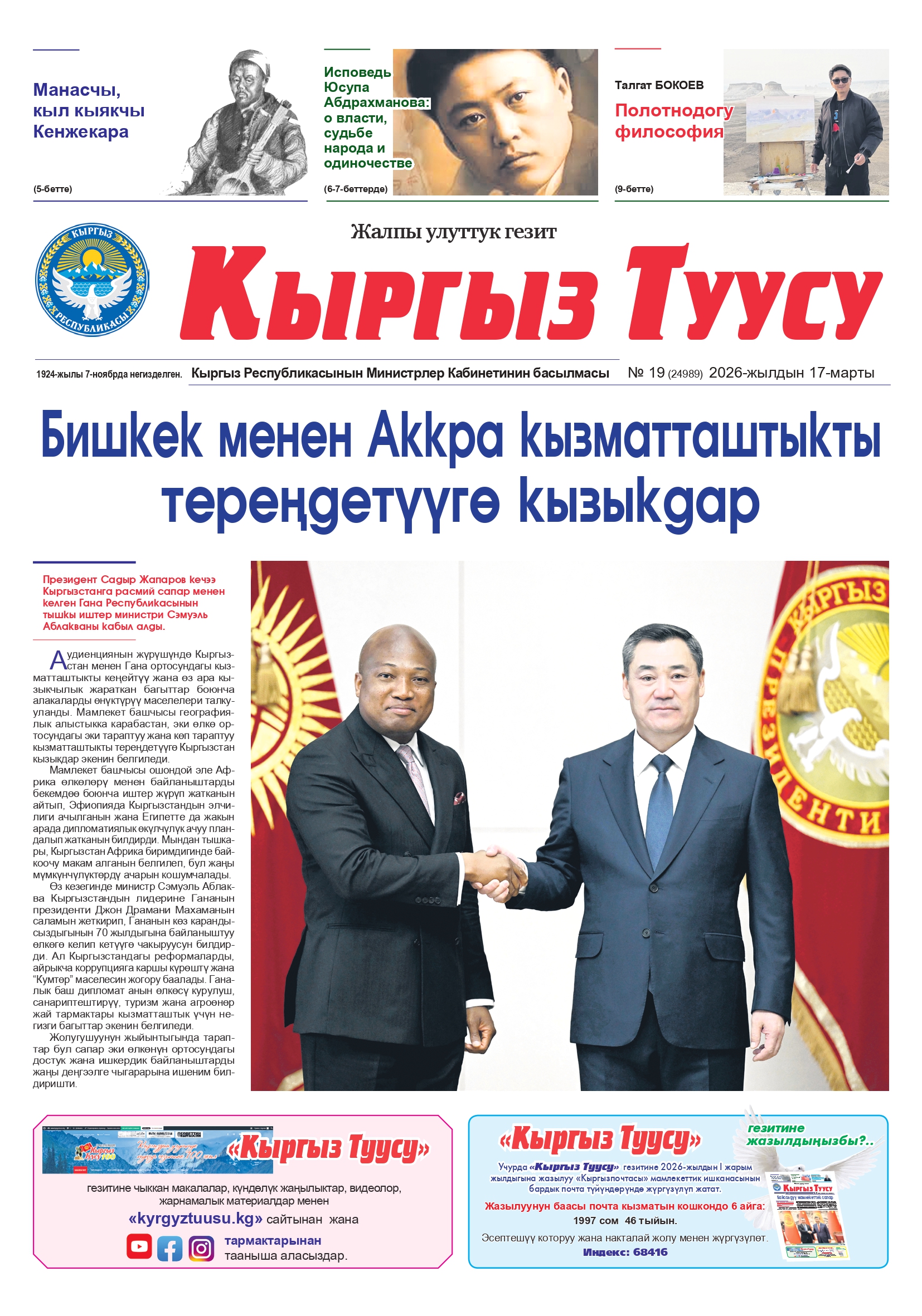 Башкы бетке Гезит №19 (24989) 2026-жылдын 17-марты Гезит №19 (24989) 2026-жылдын 17-марты автор Гулмайрам Рахманбердиева - 17.03.2026 0 381 Бөлүшүү FacebookXWhatsAppTelegramEmailCopy URL БАЙЛАНЫШТУУ МАКАЛАЛАРАВТОРДОН ДАГЫ Полотнодогу философия Манасчы, кыл кыякчы Кенжекара Өнөрдүн өр жолунда ПИКИР КАЛТЫРЫҢЫЗ Жоопту жокко чыгаруу Сураныч, пикир жазыңыз! Сураныч, бул жерге атыңызды киргизиңиз Сиз туура эмес электрондук почта дарегин киргиздиңиз! Сураныч, бул жерге электрондук почта дарегиңизди киргизиңиз Өзүмдүн атымды, электрондук почтамды жана веб-сайтымды ушул браузерде сактоо, кийин дагы пикир калтырууга. Δ