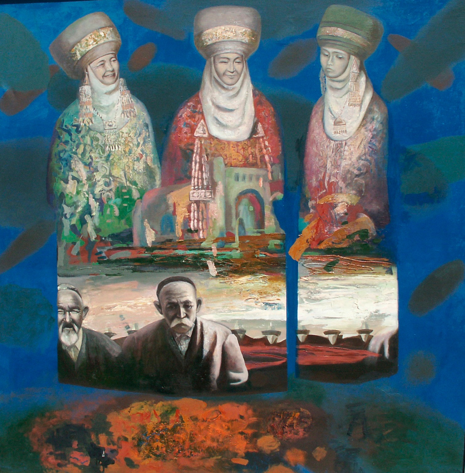 – Күүгүм кирип бараткан. Бейитке жакындаганда күн уясына батып бараткандагы акыркы нурлары мынабу мүрзөнүн дубалдарына кызарып тийип нурдантып турду. Ошол эле учурда күүлдөгөн муңдуу добуш коштоп тургансыды. Басалбай буттарым тушалып, ордумда арбалып туруп калдым. Кулагыма байыркы бабалардын ыры, муңу, күлкүсү угулгансып; сырдуу, сүрдүү минуталар закымдап өтүп жатты. Эртеси кан чыгарып, мал союп, куран окуттук. Бул сюжетти фильмге колдондум, бирок ага болбой баягы добуш кулагыман кетпей ушу күнгө жеттим. Анан эле сенин “Аксакалдар” аттуу картинаңды гезиттен көрүп калып, мынабу эскизди жасагандан кийин жаным тынчып, бир аз бошогонсуп калдым. Эми: – Тарт, тарт! – деп жанымды койбойт. Сени издегенимдин себеби да ушул айнанайын Жаныкем. Ушуну сен бүтүрбөсөң, мен живопись жазалбайм. Анүстүнө арбактар сенин “аксакалдарыңды” суранып жатышпайбы. Милдеттен кутулайын. Анан калса экөөбүздүн биргелешип жазган эмгегибиз болуп калсын.
