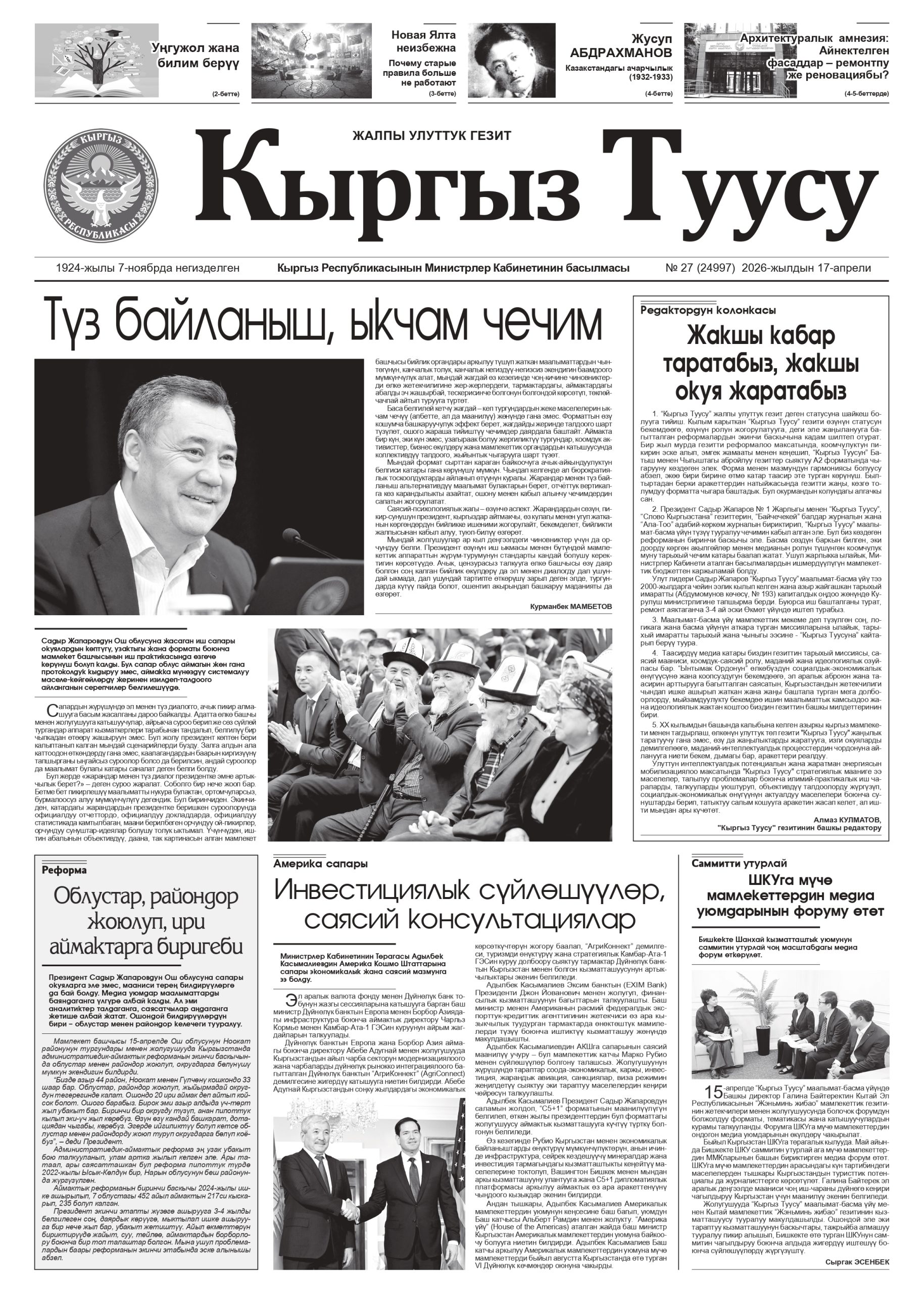 Башкы бетке Гезит №27 (24997) 2026-жылдын 17-апрели Гезит №27 (24997) 2026-жылдын 17-апрели автор Гулмайрам Рахманбердиева - 17.04.2026 0 153 Бөлүшүү FacebookXWhatsAppTelegramEmailCopy URL БАЙЛАНЫШТУУ МАКАЛАЛАРАВТОРДОН ДАГЫ Новая Ялта неизбежна Мукай Элебаев Күндөлүктөн чыккан үн Что скрывает пауза в войне вокруг Ирана ПИКИР КАЛТЫРЫҢЫЗ Жоопту жокко чыгаруу Сураныч, пикир жазыңыз! Сураныч, бул жерге атыңызды киргизиңиз Сиз туура эмес электрондук почта дарегин киргиздиңиз! Сураныч, бул жерге электрондук почта дарегиңизди киргизиңиз Өзүмдүн атымды, электрондук почтамды жана веб-сайтымды ушул браузерде сактоо, кийин дагы пикир калтырууга. Δ